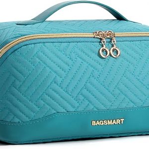 BAGSMART Makeup Bag, Travel Cosmetic Bags Water-resistent Makeup Case for Women Portable Pouch Open Flat Make Up Organizer for Toiletries, Brushes, Teal