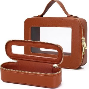 Pinkmik Travel Clear Makeup Bag with Brush Bag Portable Cosmetic Bag Case Transparent Toiletry Bag Cosmetic Organizer Storage Bag for Women (X/Brown, L+SLIM)