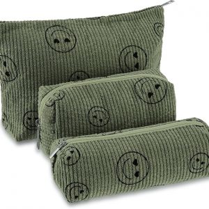 3 Pcs Makeup Bag Set for Women Corduroy Cosmetic Pouch Aesthetic Smile Travel Toiletry Bag Cute Purse Pouch Pencil Case Makeup Brushes Storage Organizer with Zipper(Army Green,Smile Face)