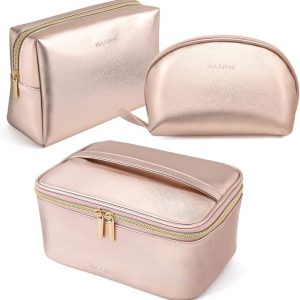 MAANGE 3 Pcs Makeup Bag Portable Travel Cosmetic Bag Large Makeup Bag Organizer with Gold Zipper Waterproof Toiletry Bags for Women and Girls(Rose Gold)