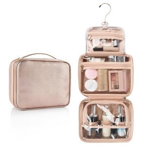Toiletry Bag for Women – Hanging Travel Toiletry Bag with 360° Hook 3 Compartments Makeup Organizer with Portable Handle PU Leather Water-resistant Cosmetic Pouch