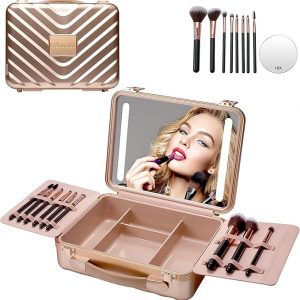 Mocado Travel Makeup Case with Lighted Mirror, Makeup Box with 8 Makeup Brushes and 10x Magnifying Mirror, Adjustable Brightness Makeup Train Case with Makeup Brushes Divider(Rose Gold)
