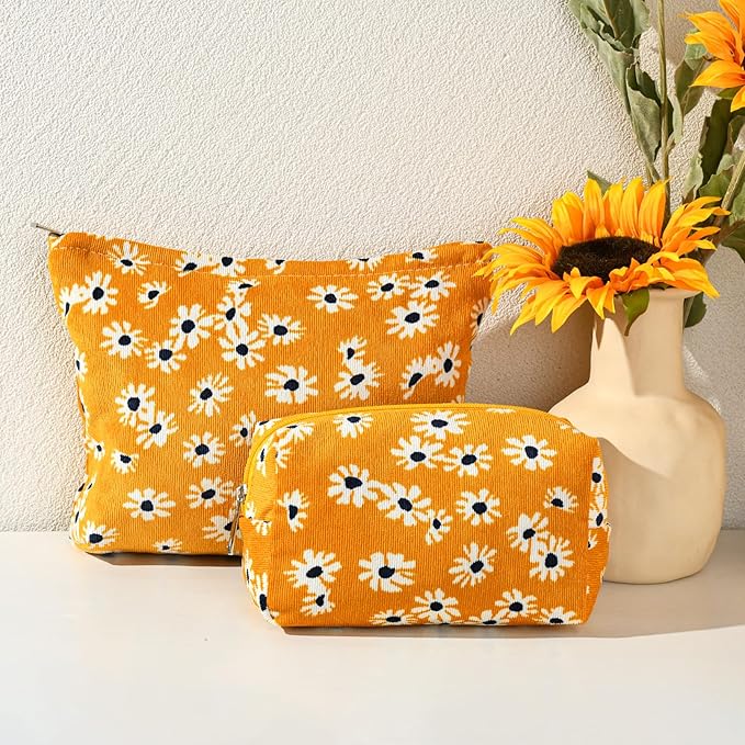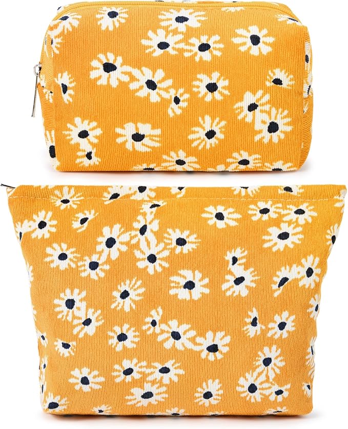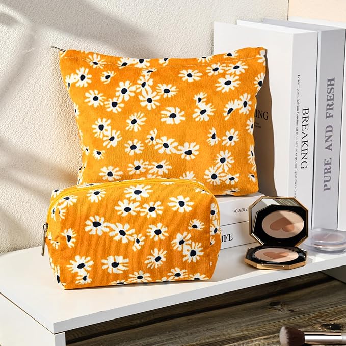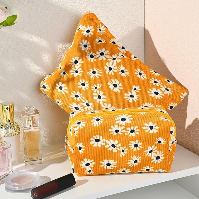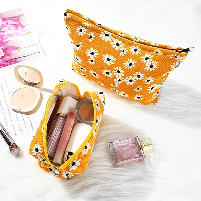 2 Pieces Flower Makeup Bag Large Cosmetic Bag Capacity Canvas Mix Travel Toiletry Bag Organizer Cute Makeup Brushes Aesthetic Accessories Storage Bag for Women,Little Flower Mix Yellow