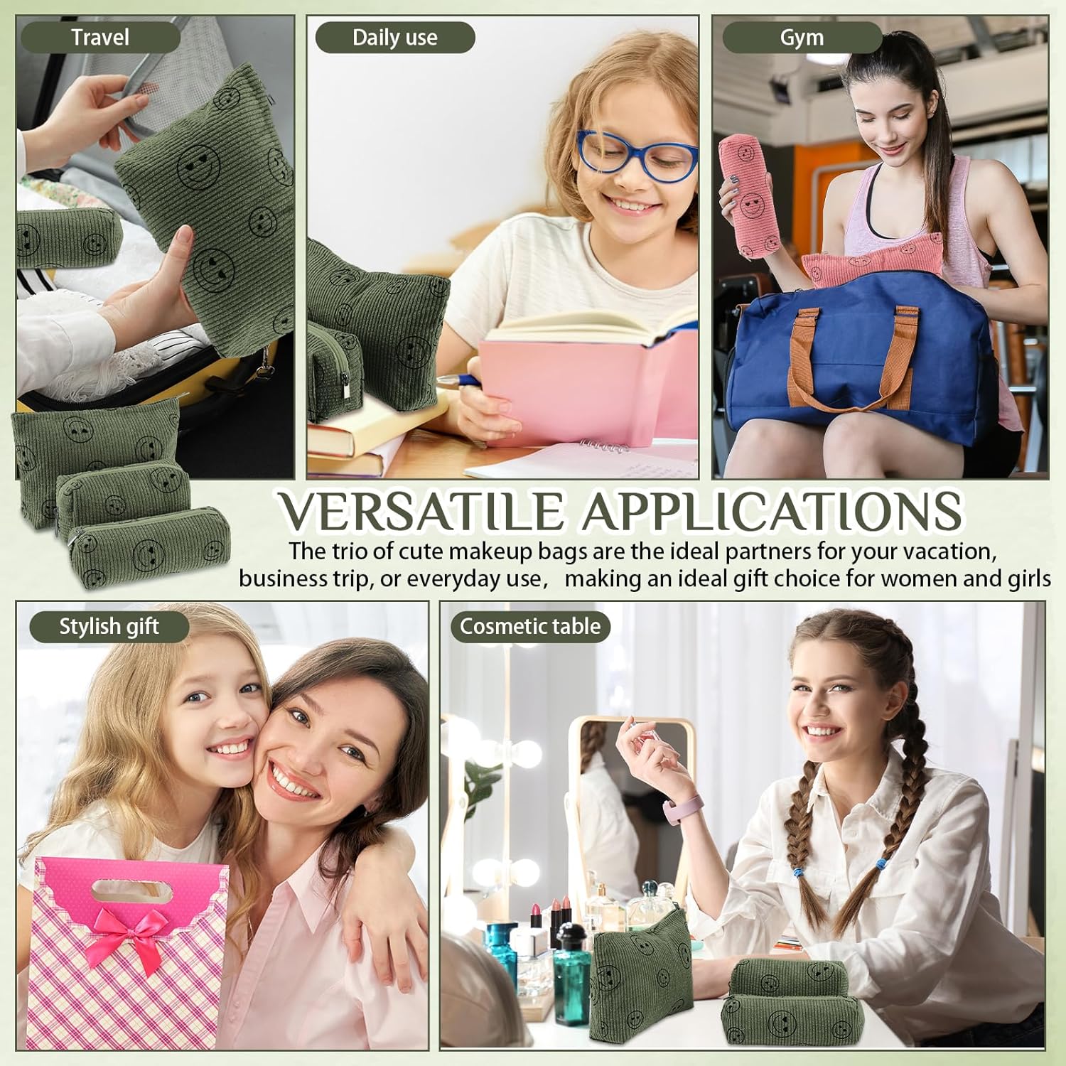 - Material and Attractive Design: the makeup and toiletry travel bag set is mainly crafted from quality corduroy material, ensuring durability and prolonged service life; The bags feature an adorable and delicate design with scattered cute smiling faces in different sizes on the army green color surface; This makes them compatible with various styles of outfits