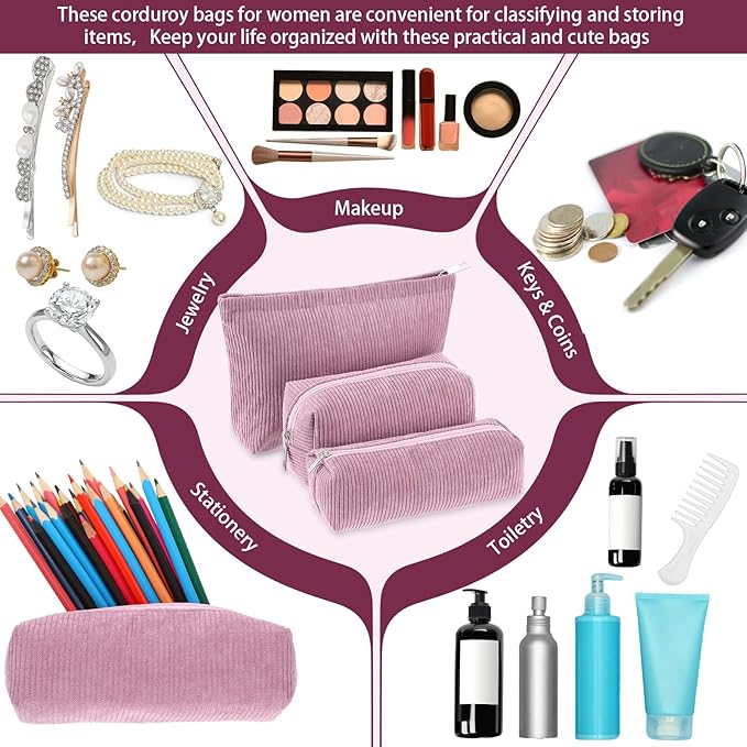 • Material and Attractive Design: the makeup and toiletry travel bag set is mainly crafted from quality corduroy material, ensuring high durability and prolonged service life; The bags feature solid rose pink color design in different sizes; This makes them compatible with various styles of outfits