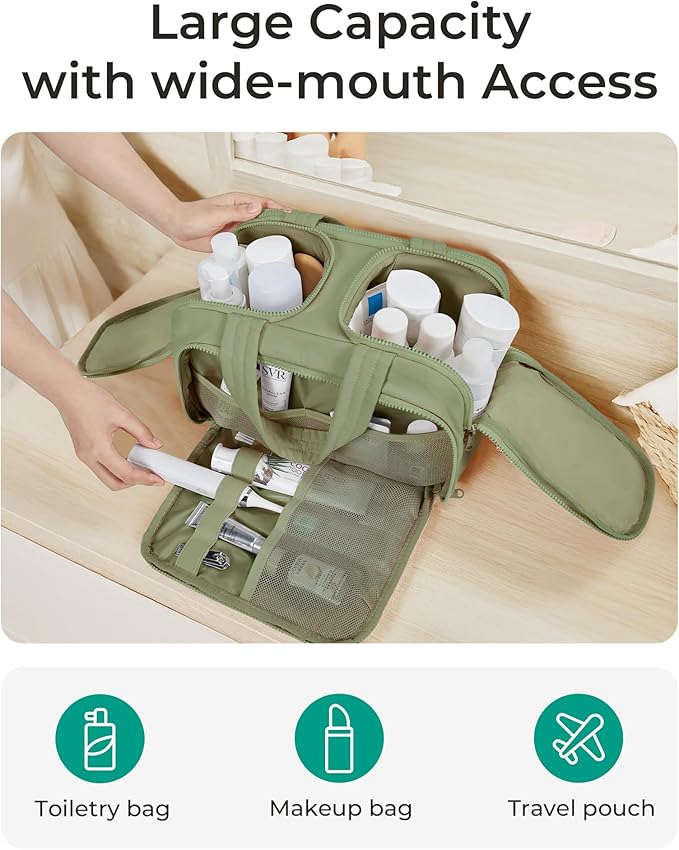 • Easy Access and Keep Upright: Full opening and not piling up for easy access to items. Double side full open design of travel bag for toiletries keeps cosmetic bottles and toiletries can stand upright in the middle compartment. Avoid leakage during transit