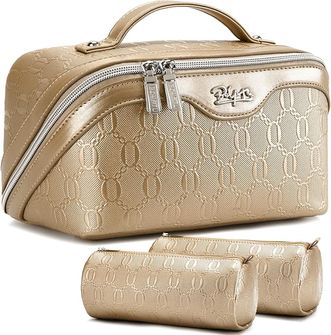 BOYATU Travel Makeup Bag for Women: Cosmetic Organizer Bag with Compartments – Leather Make up Bags Set of 3 (Gold Yellow)