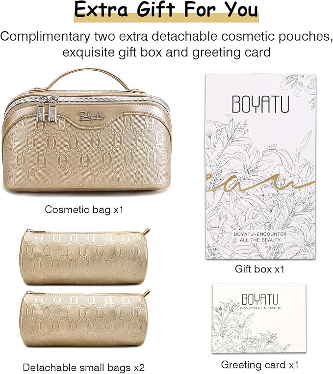 • Travel Makeup Bags for Women: This women’s cosmetic bag is made of high-quality PU leather, soft to the touch, waterproof and durable. Elegant appearance design will bring you countless awesome compliments. BOYATU portable travel cosmetic bag is a great choice and ideal companion for you.