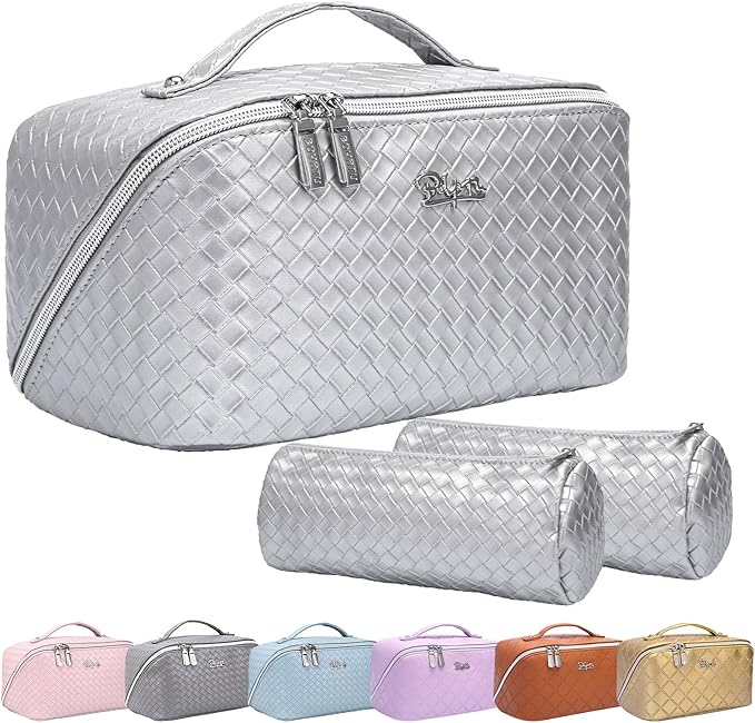 BOYATU Travel Makeup Bags for Women: 3 Piece Make up Bags Set – Large Cosmetic Bag – Vegan Leather Makeup Organizer for Traveling – Protable Toiletry Bag (L10 Silver)