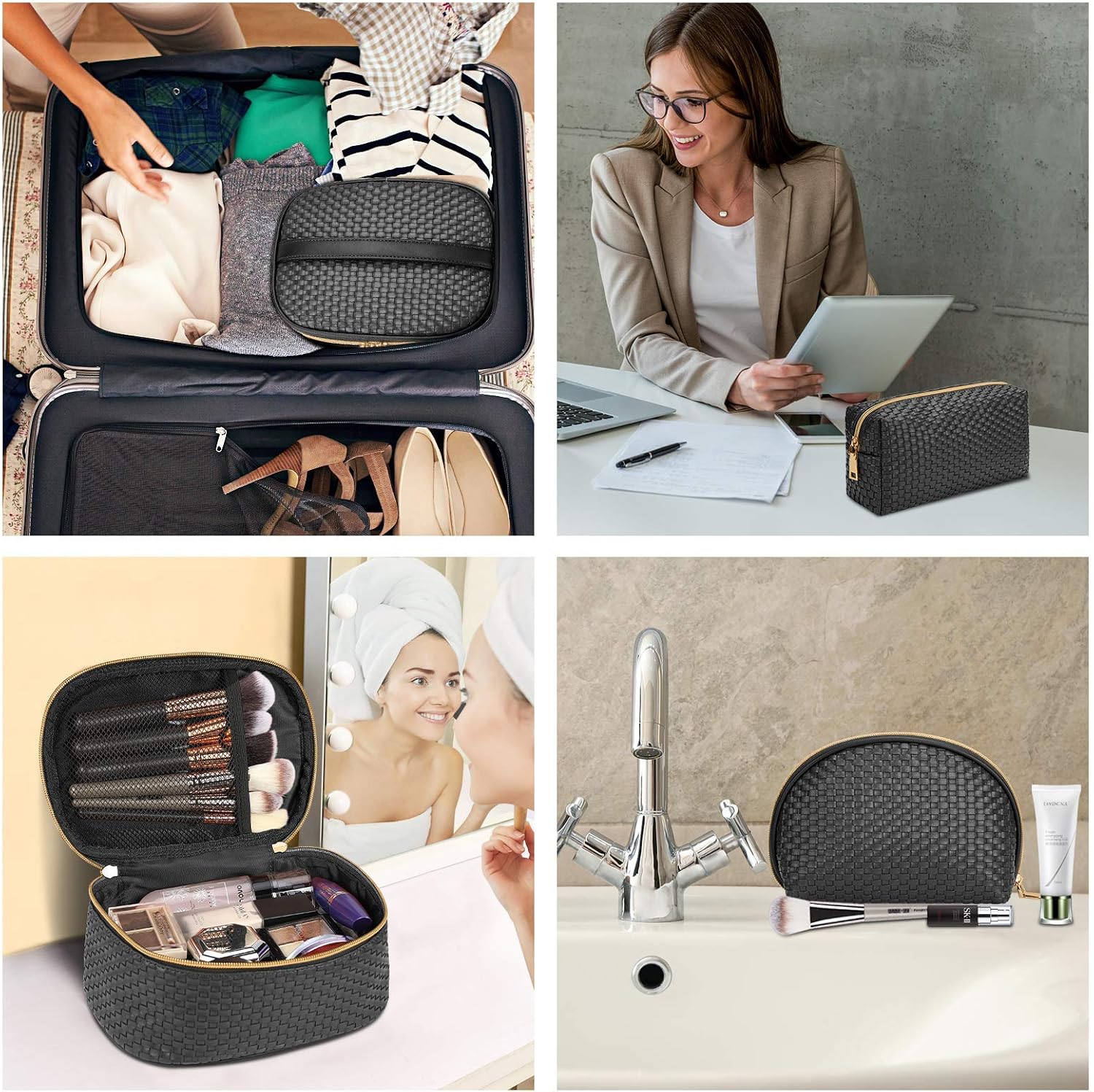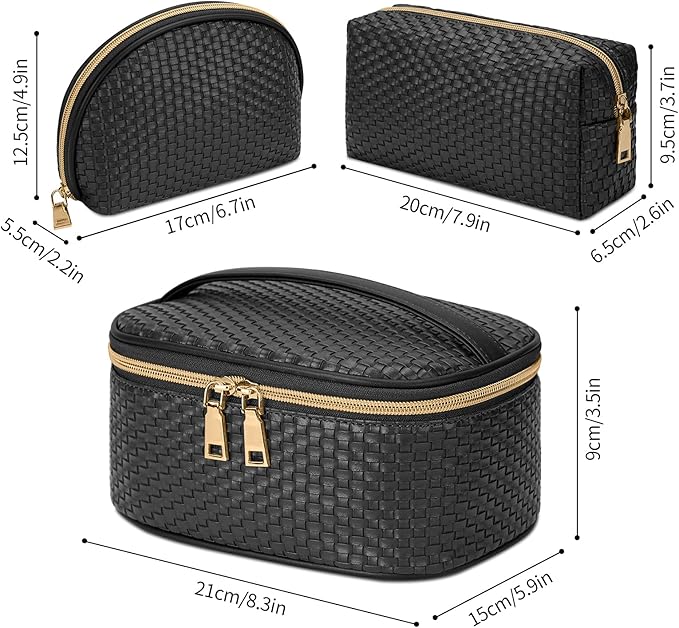 KTMOUW Makeup Bag 3 Pcs waterproof Cosmetic Bag Portable Travel Cosmetic Bag Weave Organizer storage bag (Black)