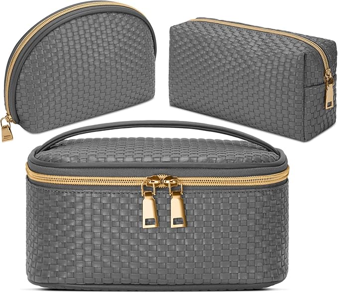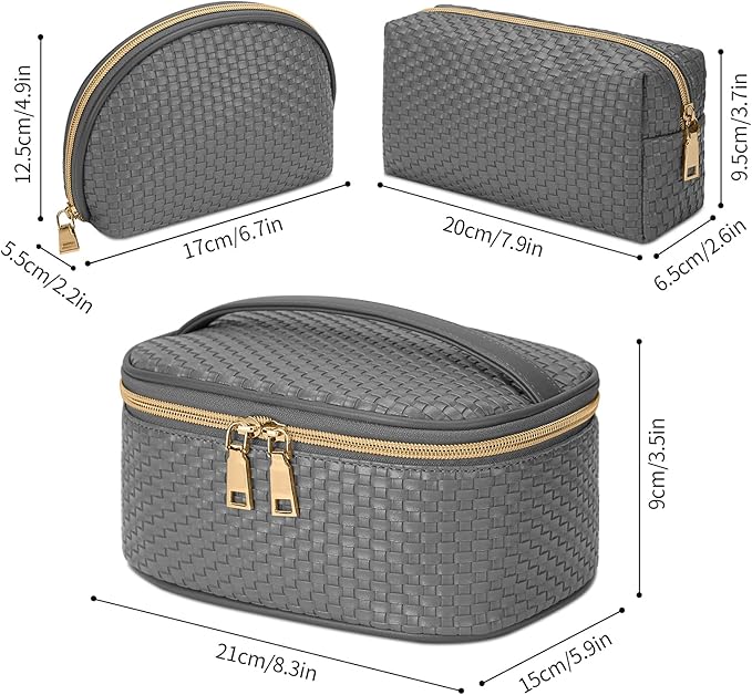 - Large Capacity: The makeup bag set has three different styles and sizes. Includes a large cosmetic bag (suitable for carrying in some luggage) and two medium cosmetic bags (suitable for carrying in a tote bag), large enough to accommodate a variety of cosmetics and toiletries, etc. Can be stored daily and carried on trips. It’s perfect to meet all your different needs.