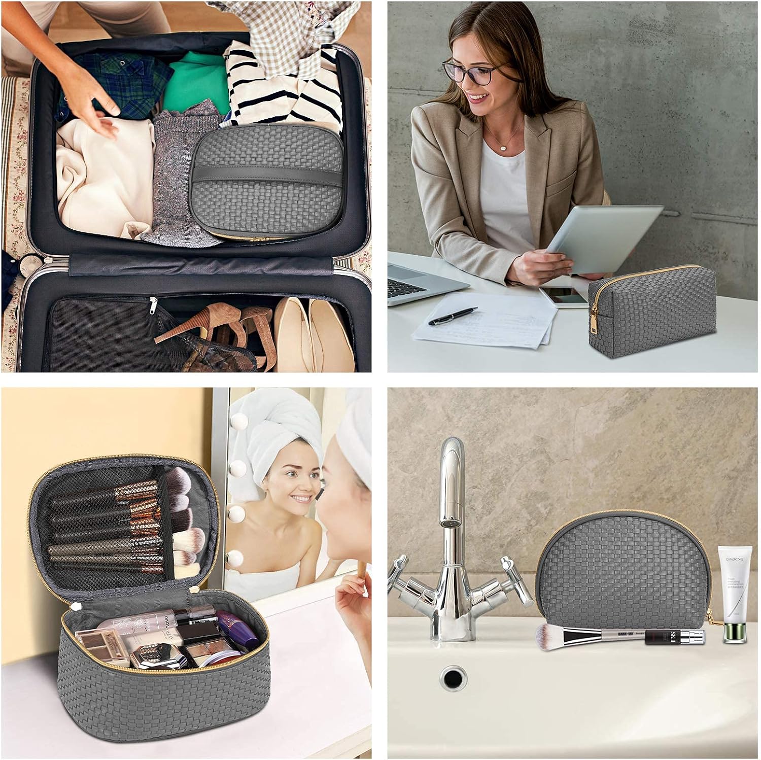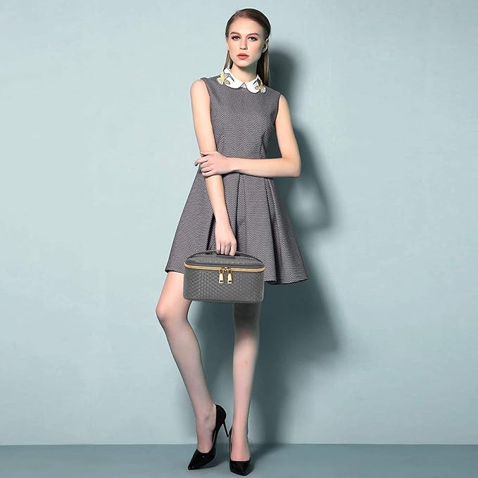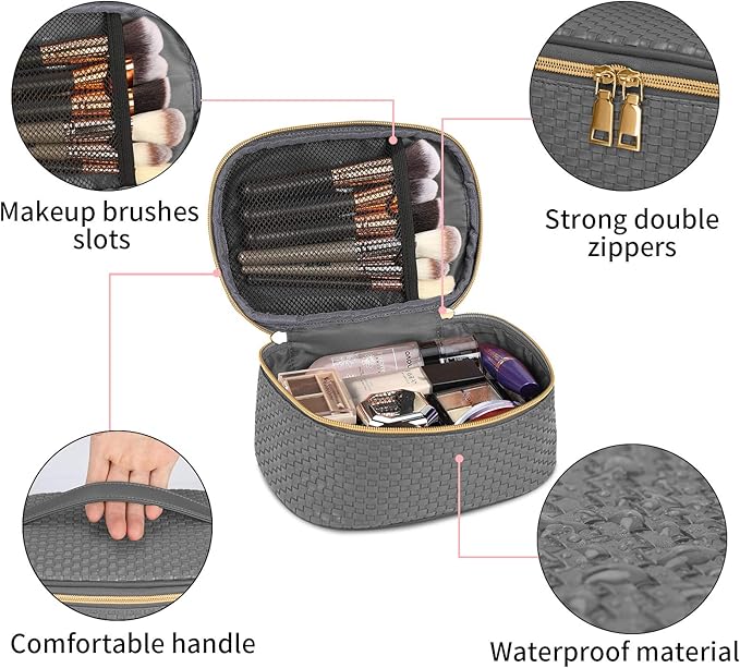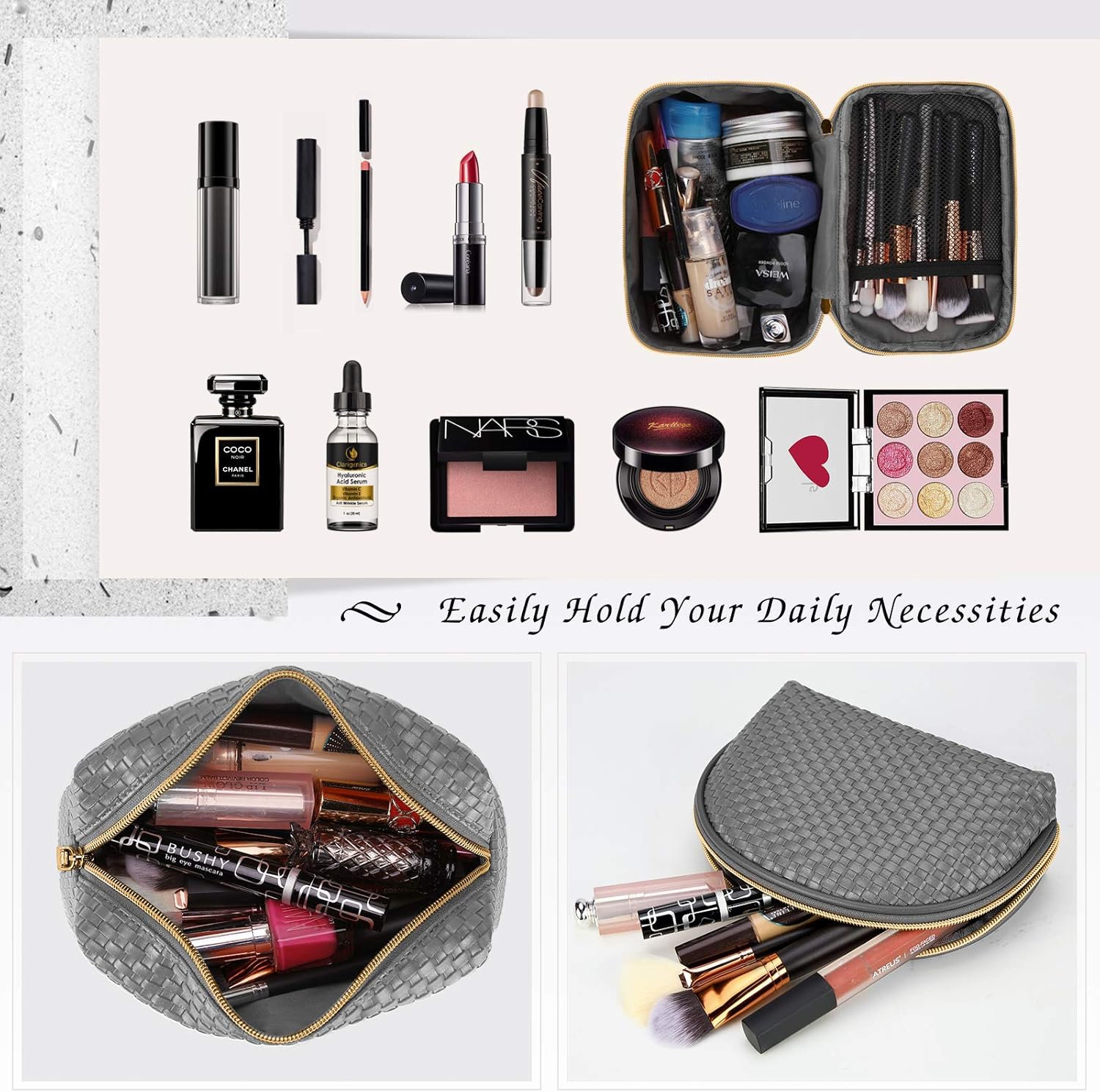 - Durable & Water-Resistant: Classic and elegant cosmetic bag is made of PU woven leather and polyester lining. It is durable, waterproof, dirt-resistant and scratch resistant. Coupled with the advanced and smooth metal double zipper design, when the tools are stored neatly, you will easily get what you need.