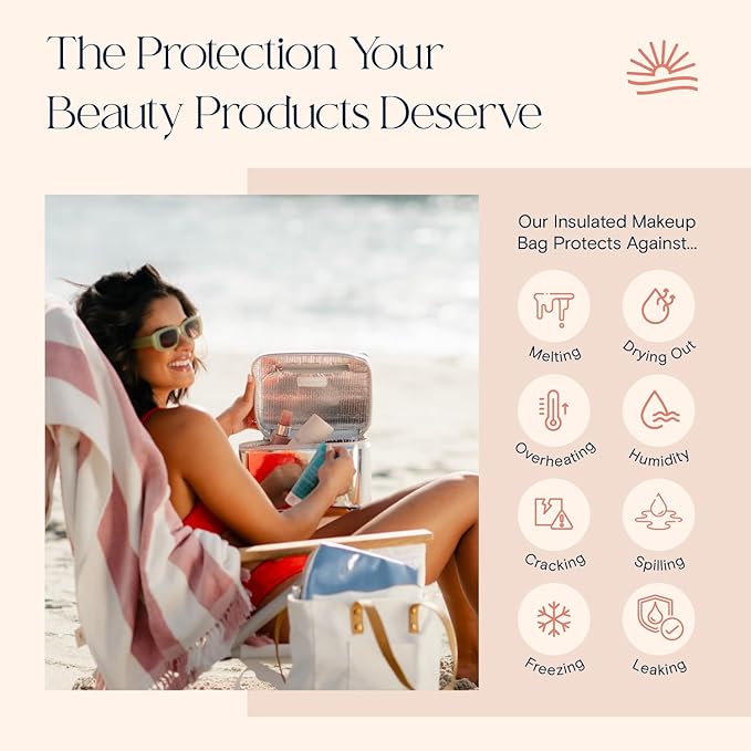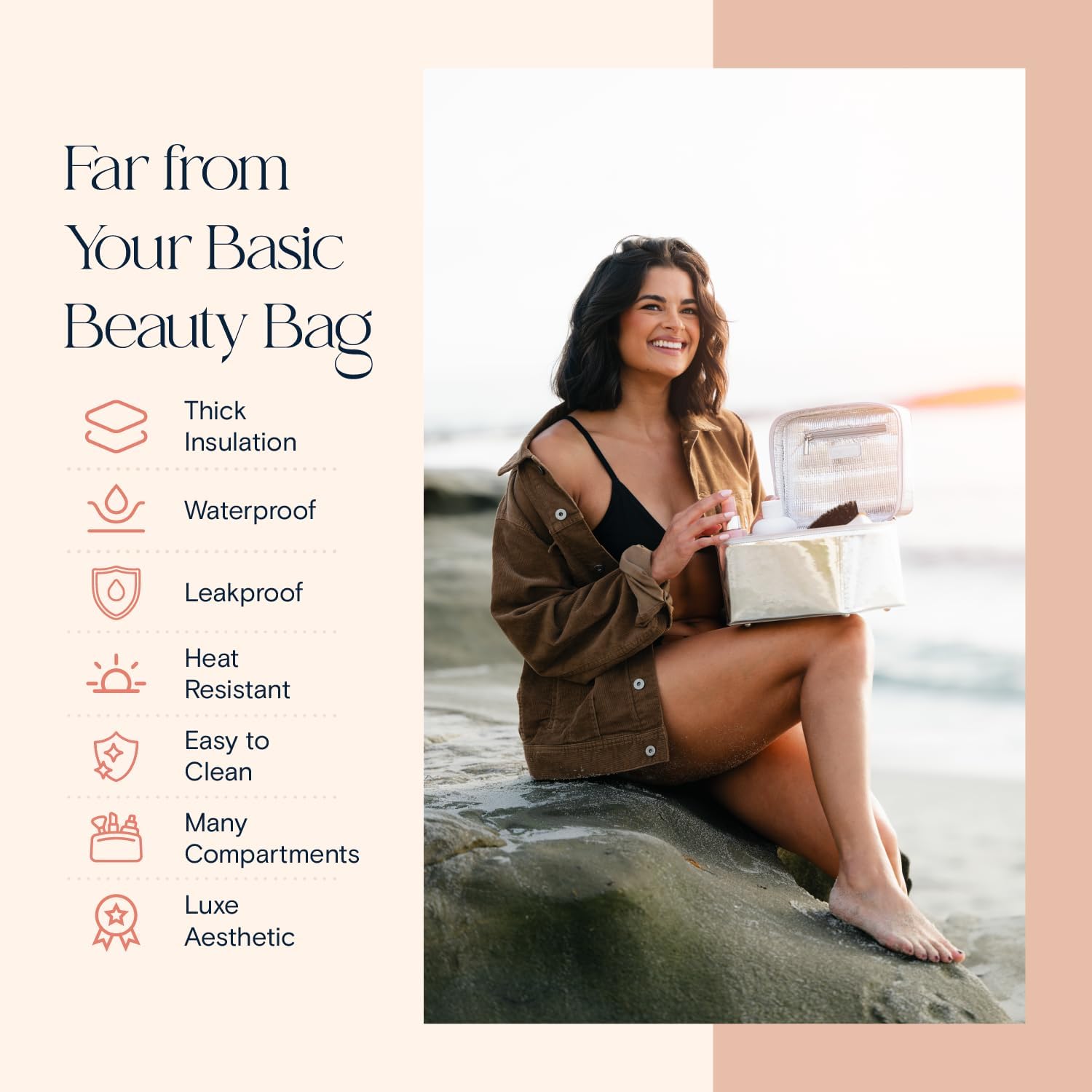 Large Insulated Travel Makeup Case – Waterproof Vegan Leather Beauty Travel Skincare Bag – Heat-Resistant Zippered Toiletry Designer Makeup Bag Shields Cosmetics from Melting, Freezing & Spoiling