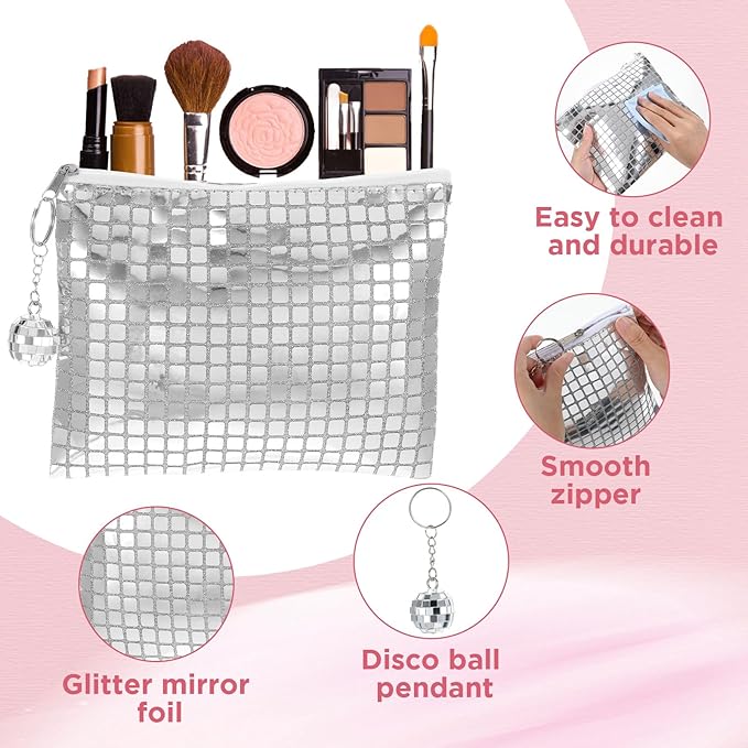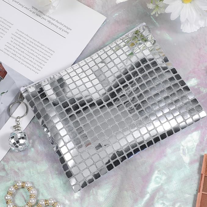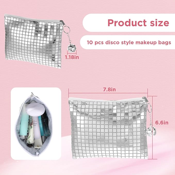 MAQUITA 10 Pack Disco Cosmetic Bags Portable Silver Glitter Sequin Mirror Makeup Organizer with Zipper, Suit for Bachelorette, New Years Eve, Disco Party Favors