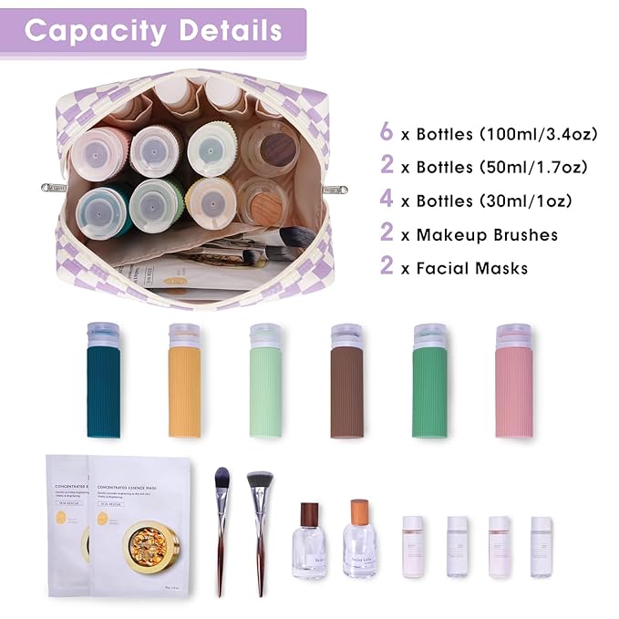 • WELL-ORGANIZED COMPARTMENTS. Practical main compartment with 5 inner small pockets could neatly organize your makeup. Main compartment could easily hold travel-size toiletries or skin-care products. It could fit 3 brushes, eyeliners, foundation, concealer, lipsticks, blushes, powder, eyeshadow pallet, mascara, lash curler, sponges, sunscreen, 3oz lotion, cream, facial cleanser and toothpaste