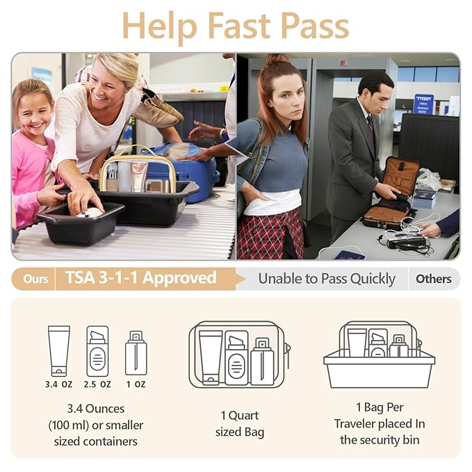 - TSA Approved, Meet Liquids Rule: The medium size clear makeup bag is 7.8 x 2.3 x 5.9 inch, it follows the TSA’s 3-1-1 Liquid Rule published by TSA. You can quickly pass the airport security screening. Note: the large size clear bag is 9.8 x 3.1 x 6.6 inch, it is larger than one quart and is not TSA approved
