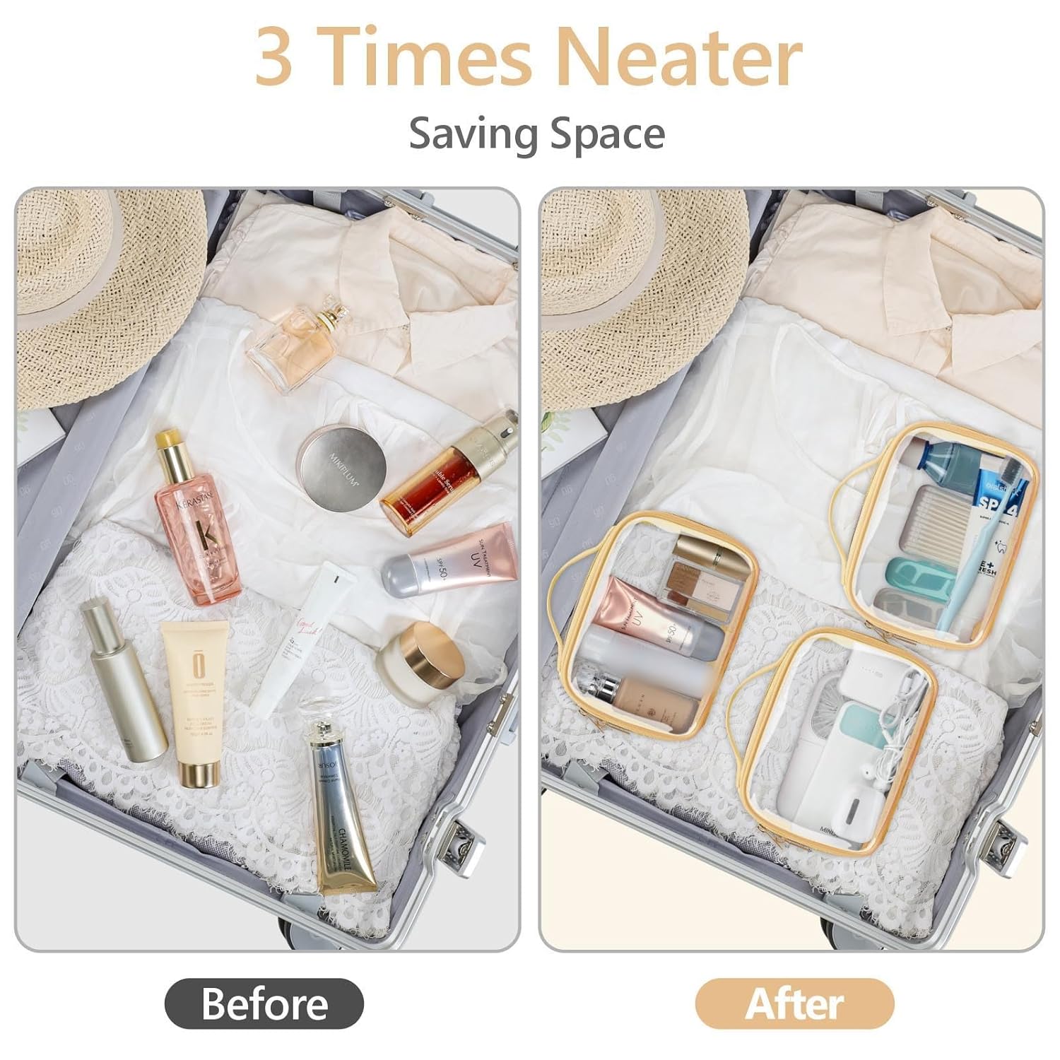 - Storing Travel Size Toiletries Bottles: The clear cosmetic bags perfectly store the travel bottles for toiletries, travel-size toiletries kit, and other travel essentials. Tips to Remove the Smell: Open the clamshell closing, wipe the plastic part inside with a wet wipe, and put the bag outdoors overnight. Tips for getting back in shape: Fill the bag with towels to help get back into shape well