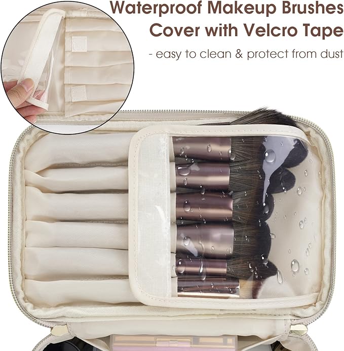 • Separate Brushes Compartment: The top flap includes 6 slots with clear make up brush cover with Velcro tape for storing more than 10 different sizes of brushes while traveling. And the clear cover is easy to clean & protect brushes from dust.