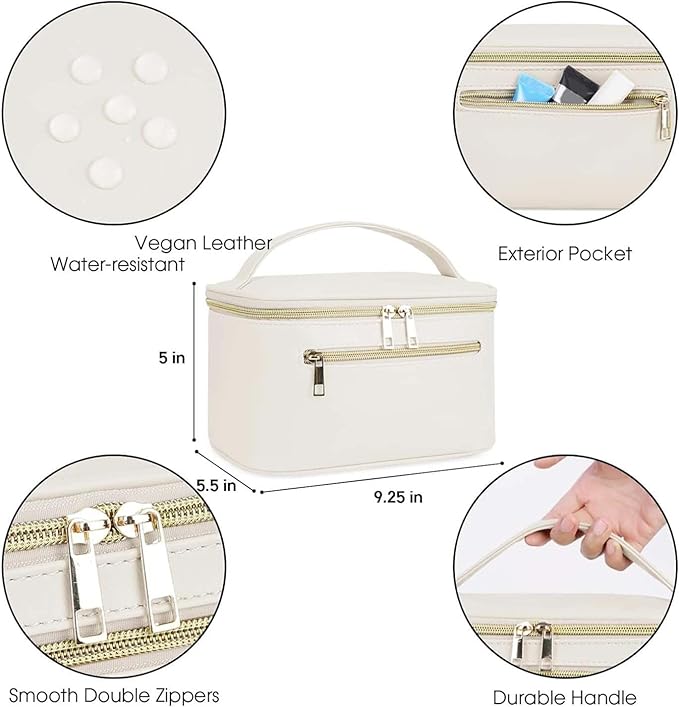 • Overall Dimensions: 9.4 x 5.5 x 5.5-inch, weight 0.57lb, which is large enough to hold all the essentials for a weekend trip or daily use. This organizer case easily fits travel-sized toiletries or full-sized skin-care products such as lipstick, lotion, facial cleanser, make up remover, foundation, concealer, eye shadow, and powder.