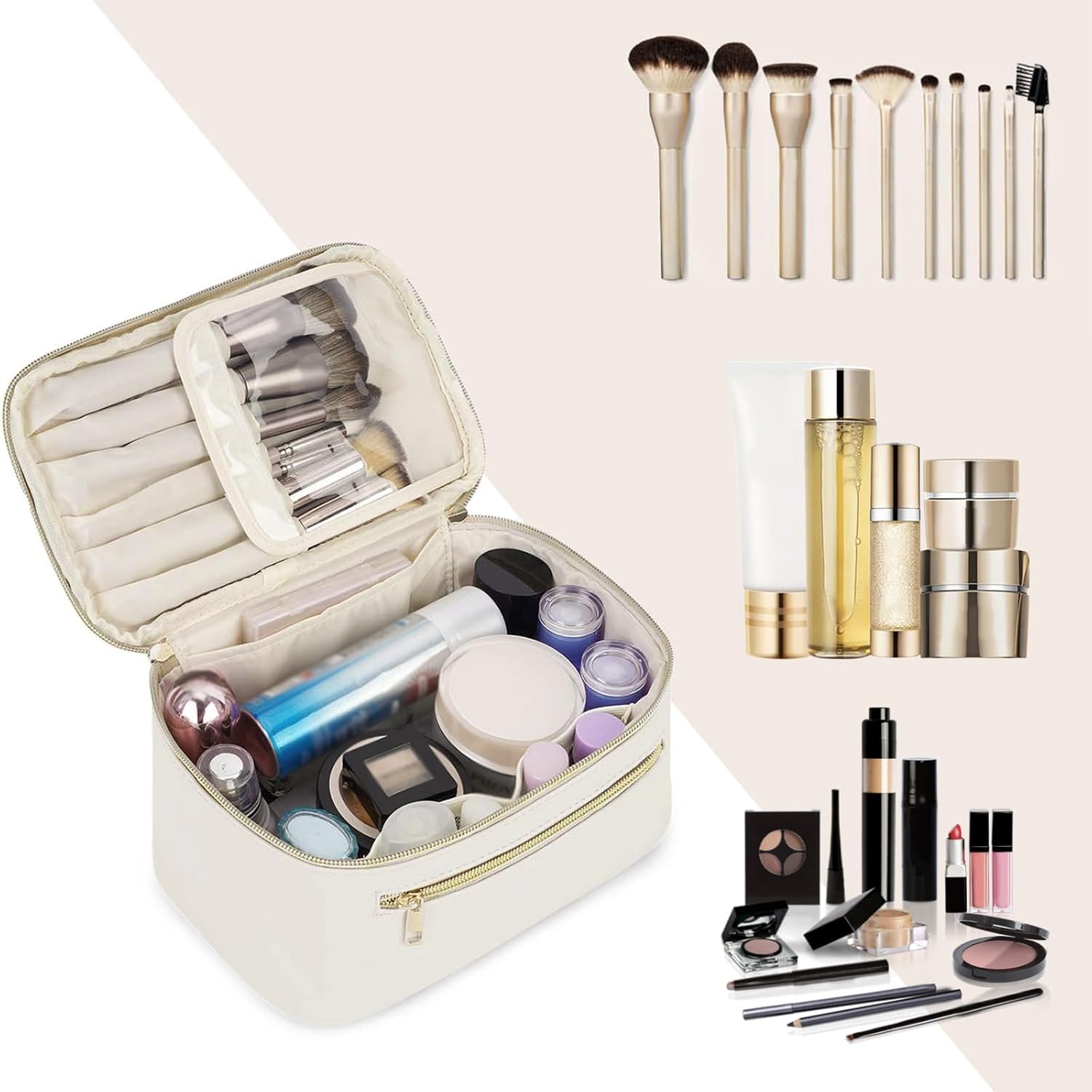 Wandering Nature Makeup Bag, Travel Make Up Organizer Cosmetic Brush Bags Case for Women in Vegan Leather, Milky White, Patent Pending